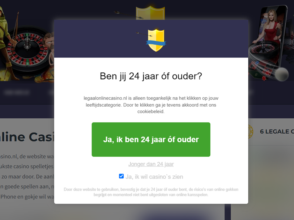 Bezoekers krijgen alleen toegang tot onze website als de leeftijd 24 jaar of ouder is. Een bezoeker die aangeeft jonger dan 24 jaar te zijn zal geen toegang krijgen op onze website. Zij worden wel direct doorgestuurd naar onze Verantwoord Gokken pagina die wij op onze website beschikbaar hebben staan. Op die pagina vertellen wij alles wat je moet weten op het gebied van verantwoord gokken bij een legaal online casino in Nederland.