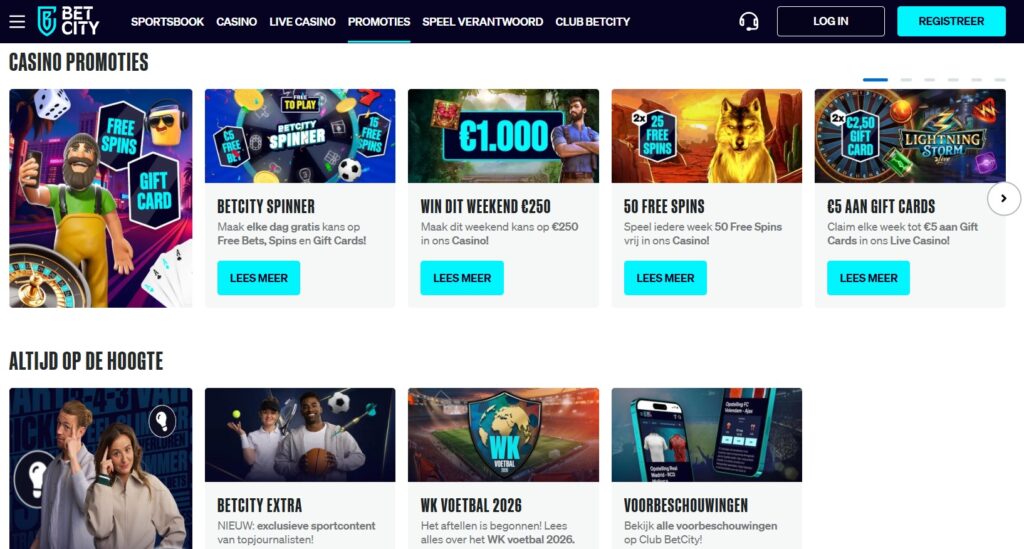 - De dagelijkse BetCity Spinner waarmee je kans maakt op free bets, spins en gift cards;
